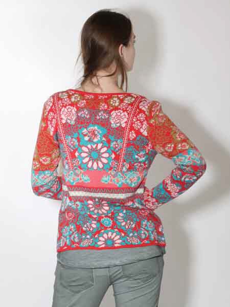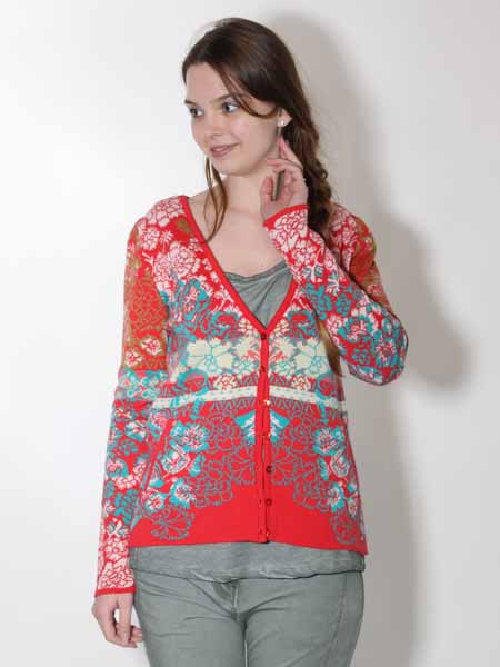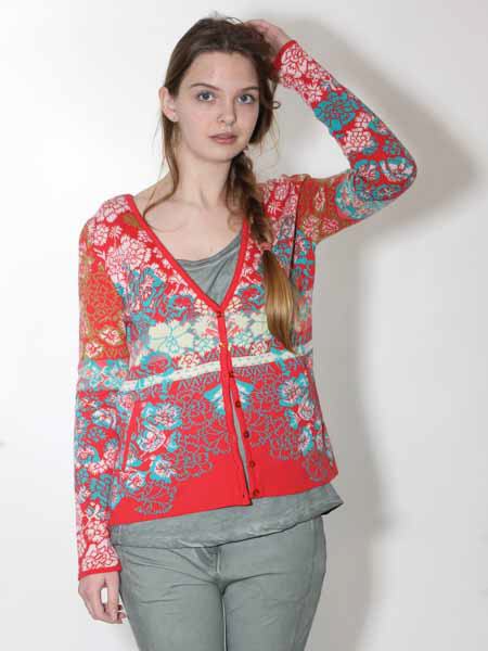 sind die Muster dieser süßen Strickjacke von Kooi, im Jacquardmuster gestrickt, Natur pur aus Baumwolle, in den Farben rot, grün, weiß, lindgrün. Sie wird mit kleinen Perlmuttknöpfen geschlossen. Sie ist leicht tailliert, hat 2 Pattentaschen und lange Ärmel. Länge ca. 62 cm.