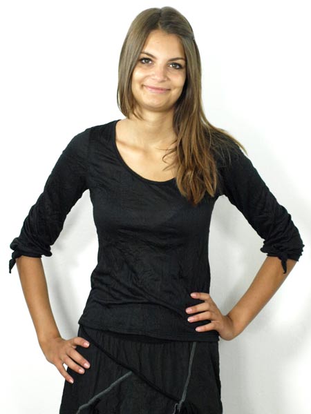 haben wir dieses Shirt von Mado et les Autres, aus knittrigem Shirtstoff. Die Ärmel sind 3/4 lang, die spitzen Enden können Sie knoten. Länge des Shirts ca. 55 cm.