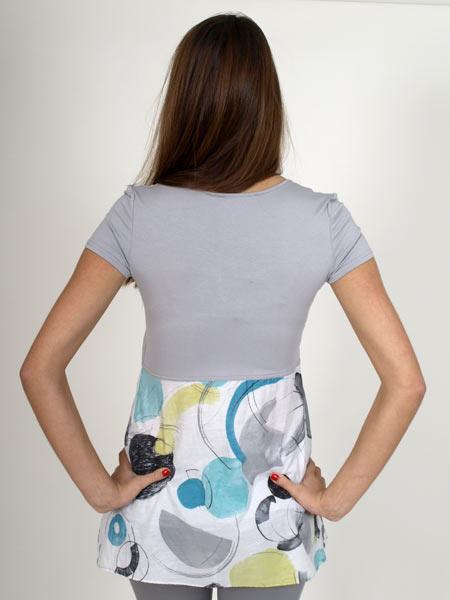 Süßes Longshirt von Mado et les Autres, aus grauem Jersey und weißem Webstoff, bedruckt in türkis/anthra/zitrone. Am Vorderteil läßt sich der Saum in der Länge raffen. Länge der Tunika ca. 85 cm.