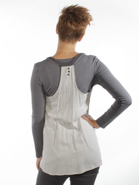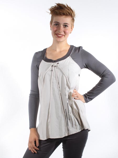 ist diese Tunika von Mado et les Autres, ein Basic-Shirt mit einer ärmellosen Tunika darüber. Die beiden Teile sind an den Seitennähten mit einigen Stichen verbunden. Wir haben die Tunika mit grauem Shirt und sandfarbener Tunika dazu. Die Tunika ist am Vorderteil bedruckt, wird seiltich mit RV geschlossen. Sie ist dekoriert mit Biesen und Knöpfchen. Länge ca. 79 cm. Wir zeigen dazu den Crashrock von Mado.