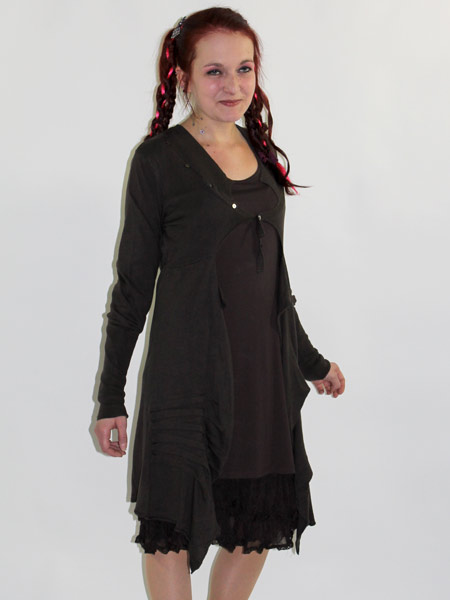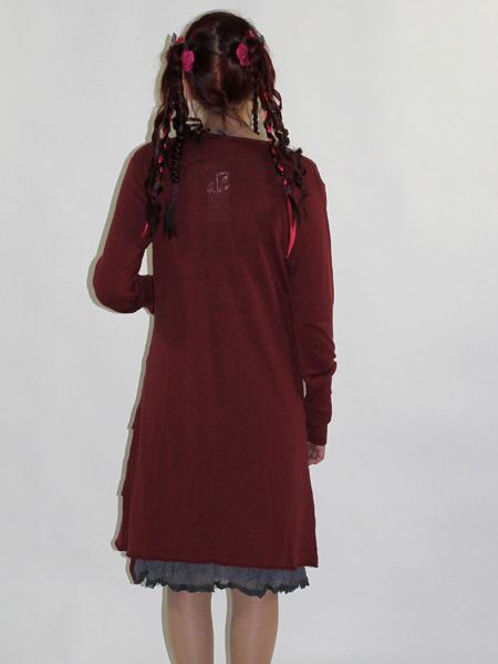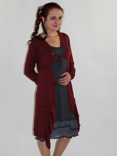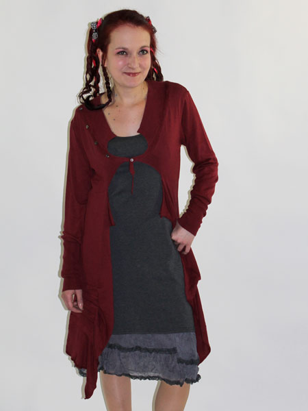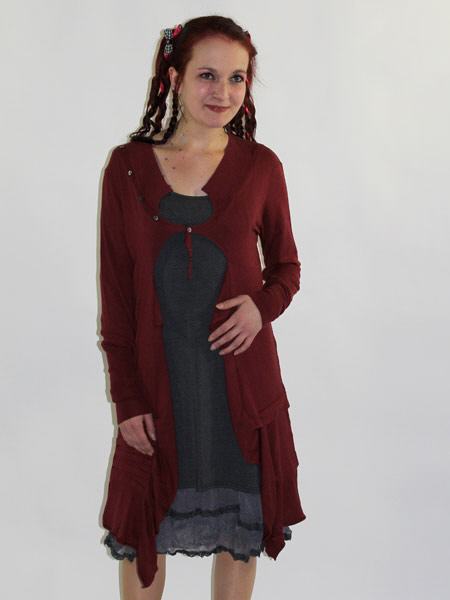 im Schnitt ist diese lange Strickjacke von Mado et les Autres, wir haben sie in weinrot und in braun (marron) im Angebot. Sie wird mit Strickbändern und einem Knopf geschlossen, sie hat Empirenaht, hat abgenähte Biesen an den Vorderteilen. Der Saum ist zipflig. Länge ca. 93 cm an der hinteren Mitte, vorne länger. Sie paßt toll über die langen Tuniken von Mado.
