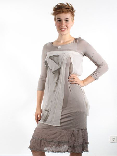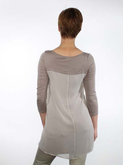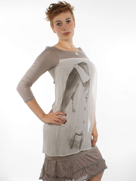 in den Farben und im Material ist diese Tunika von Mado et les Autres. Wir haben sie in beige/sand. Die Tunika ist ab Empirenaht an Vorder- und Rückenteil doppellagig, mit einem bedruckten Überwurf, der sich am Vorderteil öffnet. Die Tunika hat eine Länge von ca. 89 cm. Sie können den Tüllrock dazu passend bestellen.