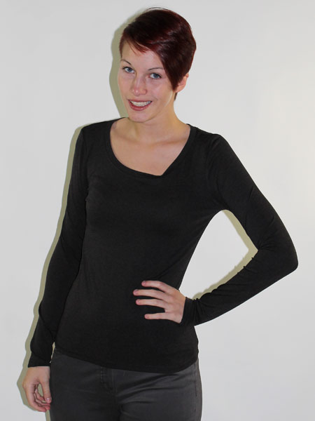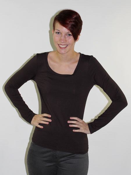 ist die runde Halsausschnittblende dieses Shirts von Mado et les Autres, so wird der Ausschnitt leicht asymmetrisch. Wir haben es in schwarz und rotbraun vorrätig.