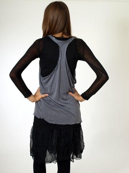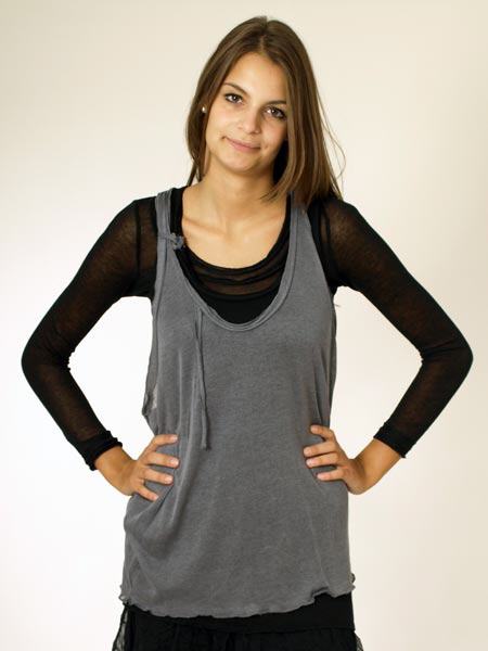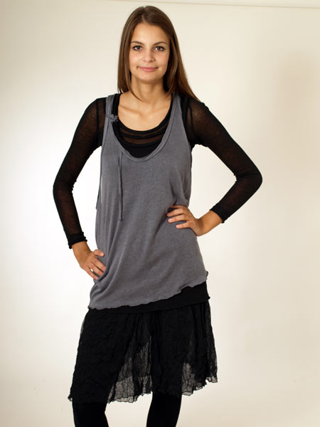 ist diese schicke ärmellose Tunika von Mado et les Autres, wir haben sie in grau/schwarz, sie ist doppellagig. Wir zeigen dazu das schwarze Woll-Viscoseshirt und schwarze Leggings. Länge ca. 77 cm.