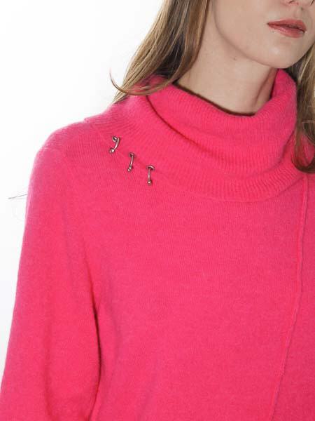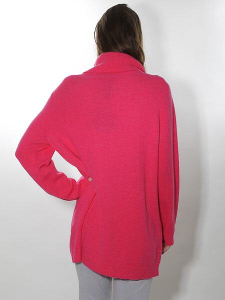 haben wir diesen kuscheligen Pulli von Simclan. Er hat einen halsfernen Rolli, ein Hingucker sind die 3 Ringe, die durch Metallösen gezogen, wie Piercings. Der Pulli ist oversized geschnitten in leichter A-Form zum Saum hin. Er ist am Saum leicht asymmetrisch geschnitten, mit einem Schlitz an der vorderen Mitte. Länge ca. 78 cm in Größe 38. 1/2 Oberweite = 55 cm. Er paßt Ihnen, wenn Sie Größe 40 tragen.