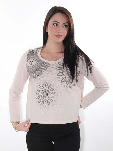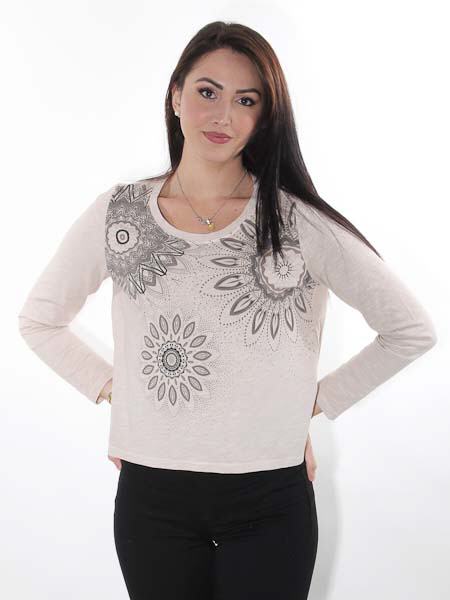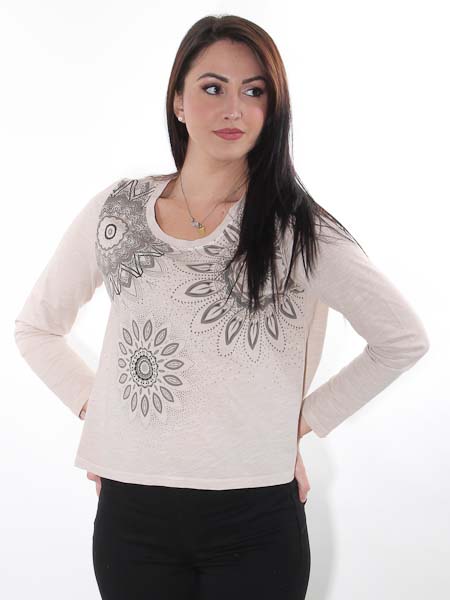 ist dieses Baumwollshirt von Simclan, wir haben es in der Farbe sand (mit Druck in schlamm, anthra). Es ist bequem geschnitten, gerade Form, nicht figurnah. Sie können im Zweifel eine Größe kleiner wählen. 1/2 Oberweite = 50 cm, 1/2 Saumweite = 54 cm. Länge ca. 55 cm am Vorderteil und 57 cm am Rückenteil in Gr. 38.