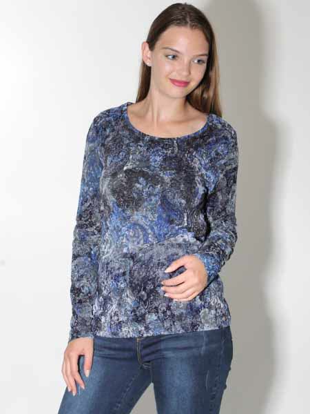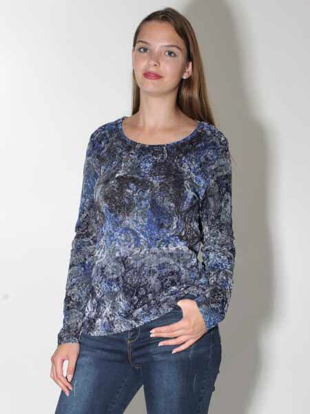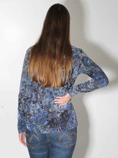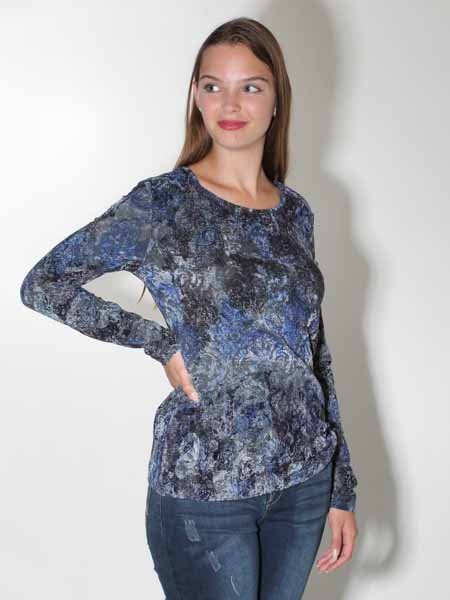 ist dieses Shirt von Simclan, aus einem samtartigen elastischem Stoff gearbeitet, der ein wenig strukturiert ist und floral und mit Paisleys bedruckt ist in den Farben königsblau, dunkelblau, grau, anthra. Das Shirt ist leicht tailliert. Länge in Gr. 38 ca. 64 cm.