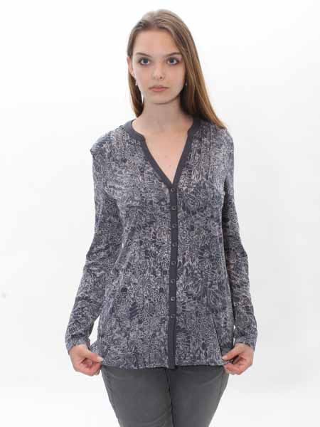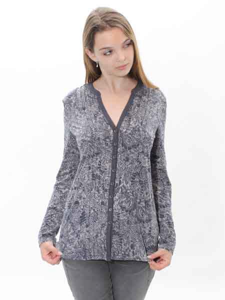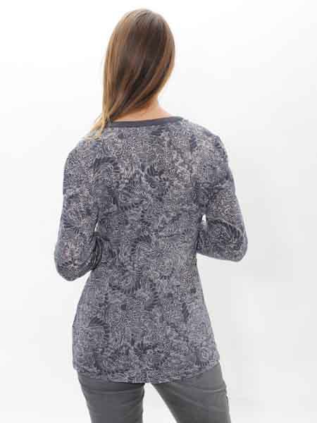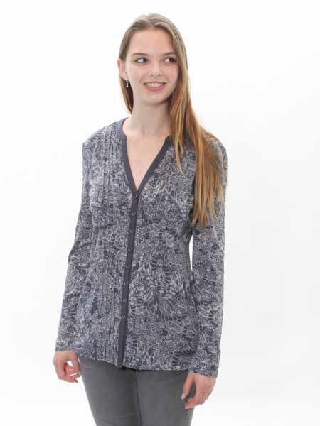 ist der Jerseystoff dieser Bluse von Simclan. Die Knopfleiste und die Halsausschnittblende sind aus anthrafarbenem Jersey. Parallel zur Knopfleiste laufen senkrechte Biesen. Länge der Bluse ca. 70 cm.