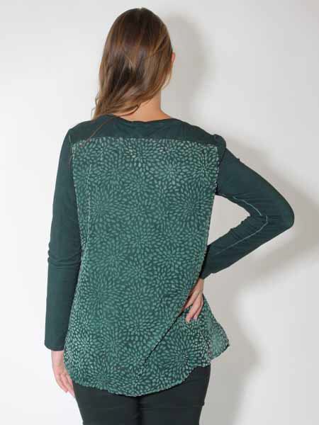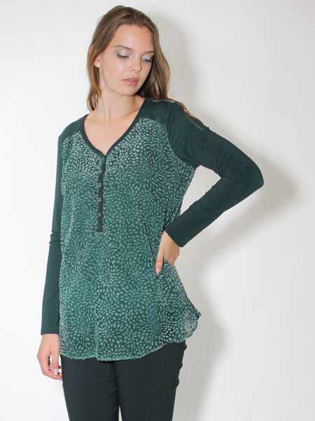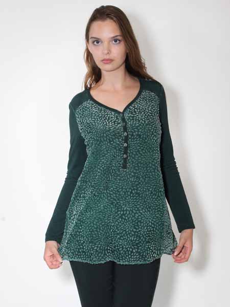 ist diese dunkelgrüne Bluse an Vorder- und Rückenteil ab Schulterpasse, über dem dunkelgrünen Jersey ist die Bluse aus Ausbrennerstoff in dunkel-/hellgrün. Die Bluse ist durchgeknöpft bis zur Taille. Der Saum ist am Vorderteil gerundet, die Bluse ist vorn länger als hinten. Länge ca. 73 cm vorn und 70 cm hinten. Passend zur Bluse haben wir einen Loop im Angebot.