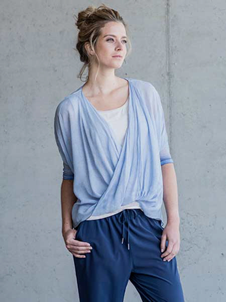 hat diese Viscosebluse von Simclan, in einem verwaschenen Jeansblauton. Sie hat Fledermausärmel mit einem elastischen Bund, so daß Sie die Ärmel auch nach oben schoppen können, ohne dass sie rutschen. Das Vorderteil hat einen Wasserfallkragen, der Stoff ist einmal gedreht. Tragen Sie diese schicke Bluse einfach über Tops. Länge ca. 62 cm am Rückenteil.