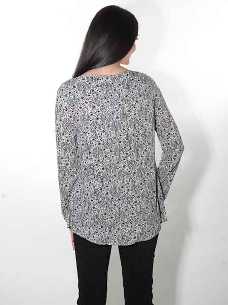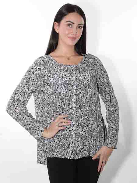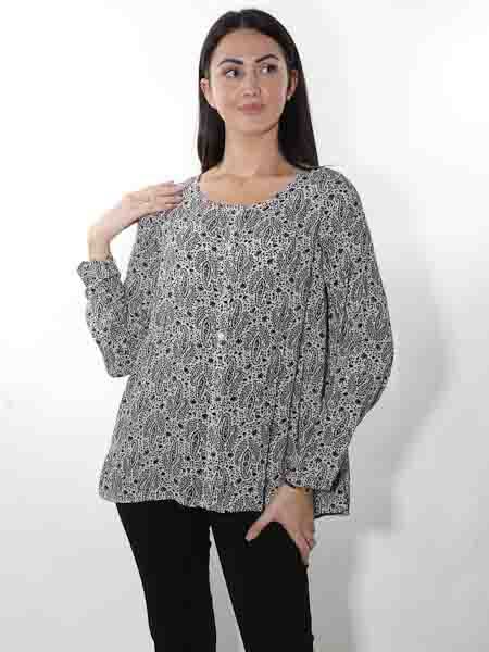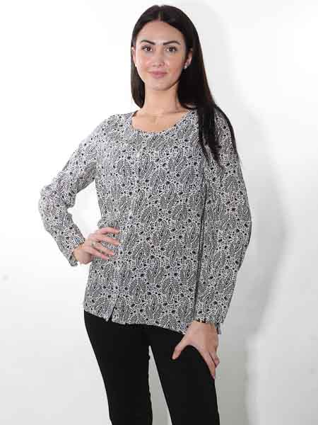 ist der wollweiß schwarze Viscosestoff dieser lässigen Bluse von Simclan. Sie hat einen runden Halsausschnitt, ist vorn durchgeknöpft mit Perlmuttknöpfen. Sie ist A-förmig geschnitten, herrlich bequem. Vorn ist sie kürzer als hinten, die Saumkante am Rückenteil ist gerundet. Länge ca. 69 cm vorn und ca. 75 cm hinten in Größe 38.