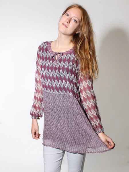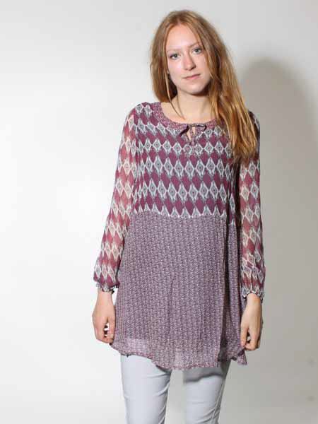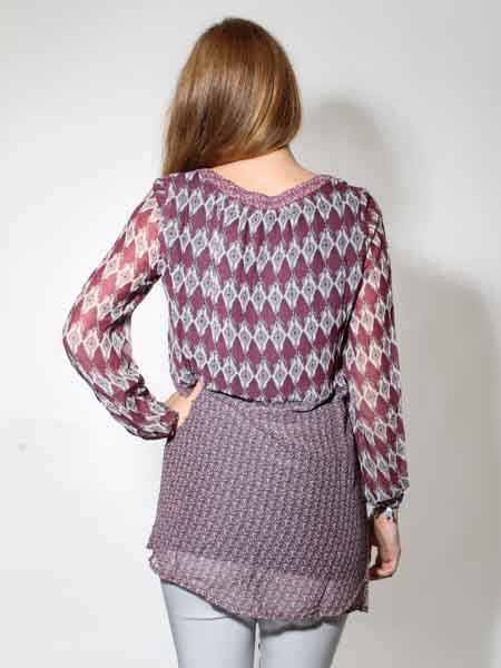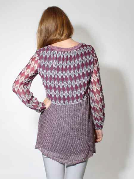 ist diese süße Bluse an Vorder- und Rückenteil, gefüttert mit leichtem, elastischem Viscosejersey. Die Oberstoffe sind unterschiedlich in weinrot/anthra/silber gemustert. Die Ärmel sind leicht transparent, haben am Handgelenk einen Gummidurchzug. Das Vorderteil hat an der Mitte des Halsausschnittes einen kurzen Schlitz, die Blende läßt sich mit Bändern variieren. Länge ca. 85 cm.
