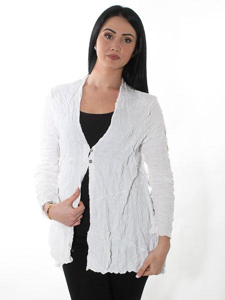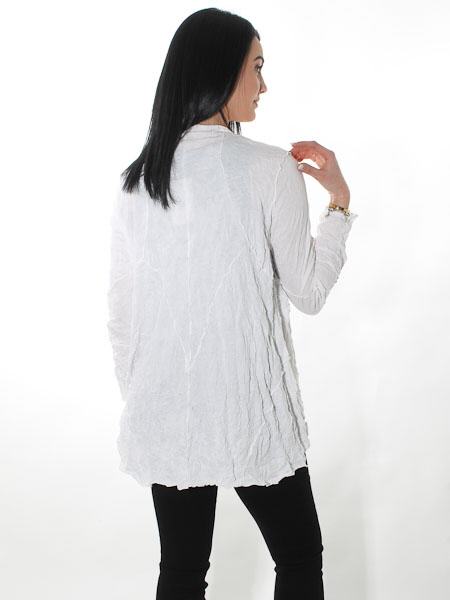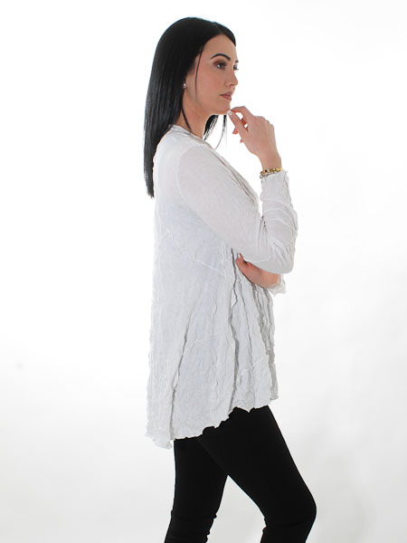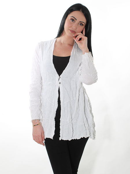 ist der elastische Jersey dieser lässigen von Simclan in der Farbe wollweiß. Sie hat einen V-Ausschnitt, wird mit 2 kleinen Metallknöpfen und Schlaufen geschlossen. Sie ist leicht A-förmig geschnitten, ist vorne kürzer als hinten. Länge ca. 72 cm an der vorderen Mitte und 85 cm an der hinteren Mitte in Gr. 42.