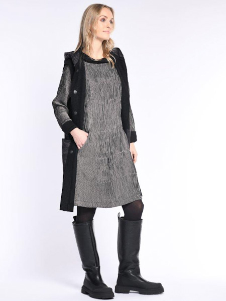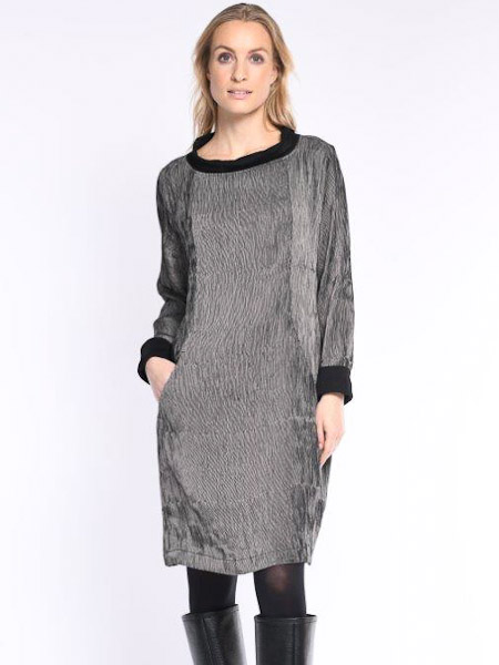 haben wir dieses Kleid von Simclan, gearbeitet aus einem strukturiertem Stoff, der wie plissiert wirkt, mit senkrechten, leicht gewellten Rippen, die etwas elastisch sind. Das Kleid ist leicht tailliert, zum Saum hin gerade. Es hat einen doppelten Stehkragen in uni schwarz. Auch die Ärmelmanschetten sind doppelt, uni schwarz. Länge ca. 96 cm in Größe 36.