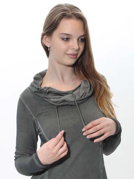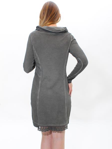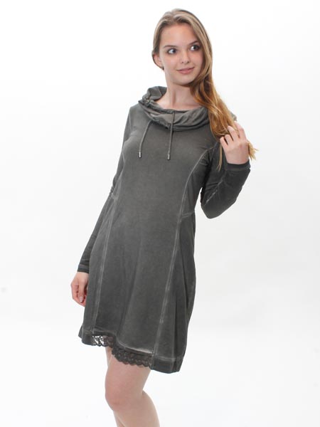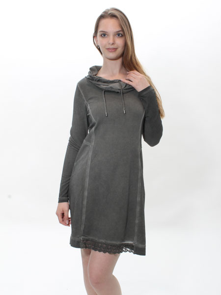 hat dieses kahkifarbene Jerseykleid von Simclan, der Kragen läßt sich mit Bändern raffen. Das Kleid ist tailliert, zum Saum hin leicht ausgestellt. Am Saum hat es an Vorder- und Rückenteil jeweils am mittleren Part eine romantische Spitzenkante. Länge des Kleides ca. 92 cm.