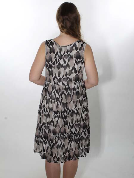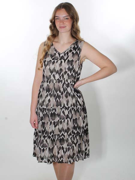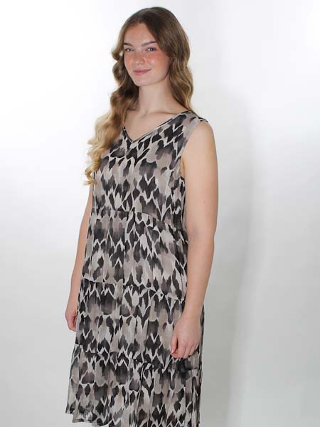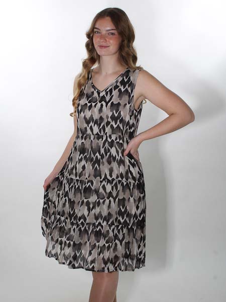 wirkt der Druck auf dem Viscosestoff dieses ärmellosen Kleides von Simclan, in den Farben beige, sand, braun. Es hat einen leicht gerundeten V-Ausschnitt. Vorder- und Rückenteil sind A-förmig geschnitten, ab Empirenaht hat das Kleid 3 Stufen, die jeweils leicht angekräuselt sind. Der Stoff ist leicht transparent, deshalb ist das Kleid gefüttert mit sandfarbenem Viscosestoff und damit blickdicht. Länge ca. 104 cm.