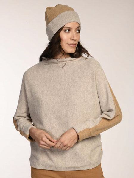 ist dieser kuschelige Pulli von Simclan, vorn toffee, hinten haselnuss. Das Gestrick ist unglaublich weich und angenehm auf der Haut. Der Pulli hat Fledermausärmel, herrlich bequem, er ist schmal an der Hüfte. Der Kragen ist angeschnitten. Die Ärmel haben doppelte Manschetten. Länge ca. 68 cm in Größe 38. Passend dazu haben wir eine Mütze.