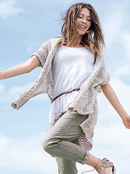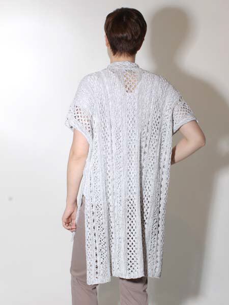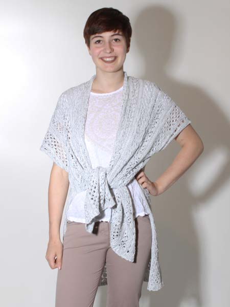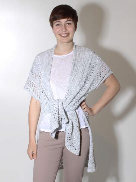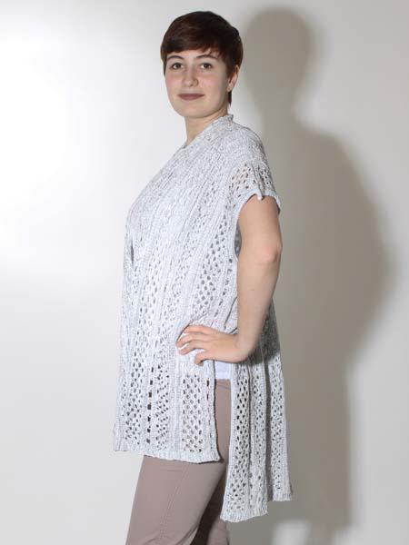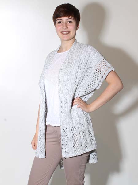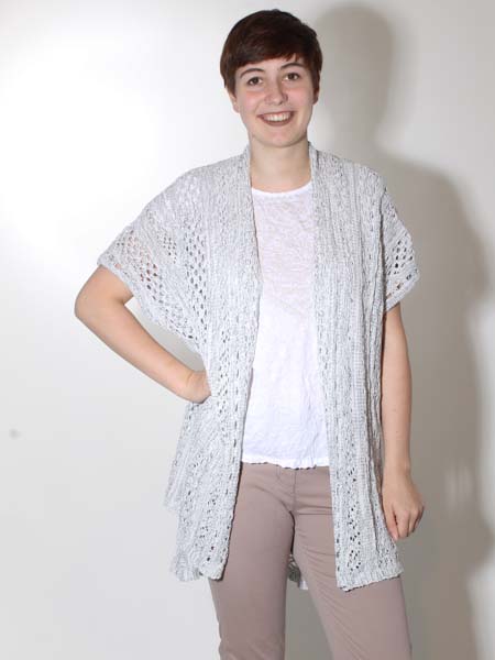 ist diese Strickweste von Simclan aus einem Bändchengran in wollweiß/graumelange. Die Schultern sind überschnitten, die Weste hat seitliche Schlitze bis zur Taille, so daß Sie auch mal die Enden der Vorderteile knoten können. Länge am Rückenteil ca. 94 cm, an den Vorderteilen ca. 80 cm. Diese Weste paßt farblich über alles.