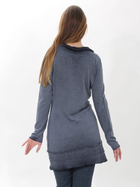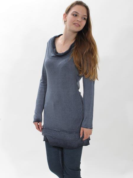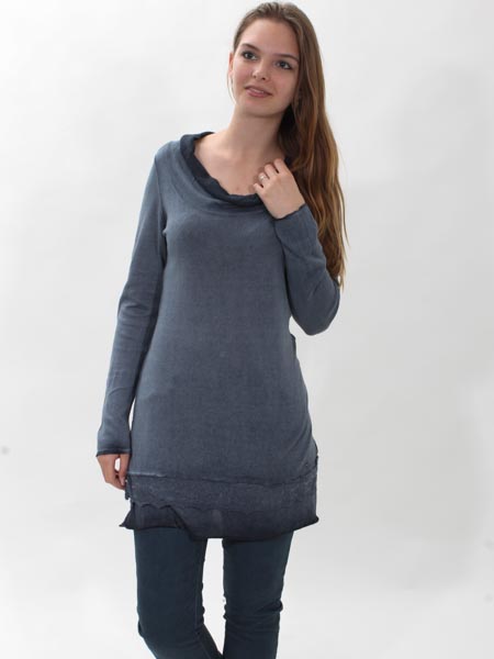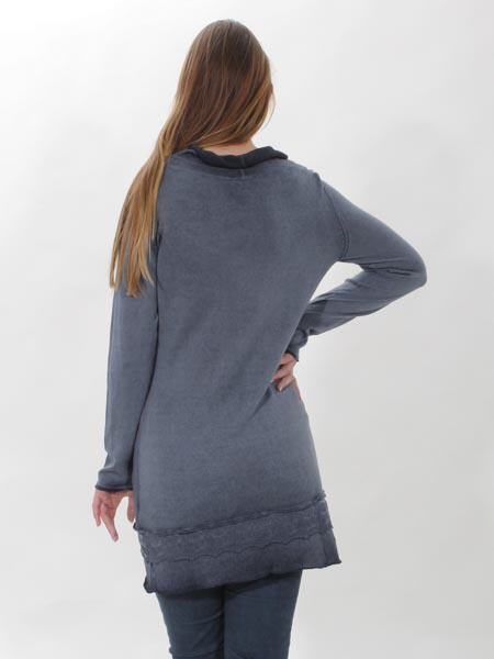 hat dieser lange Baumwollpullivon Simclan am Saum. Der Pulli in der Farbe mitternachtsblau hat zum Saum hin einen leichten Farbverlauf, wird etwas dunkler. Der weich fallende Rolli ist innen dunkelblau. Länge der Stricktunika ca. 87 cm.