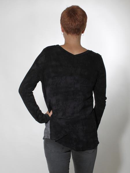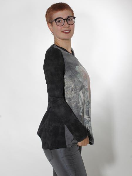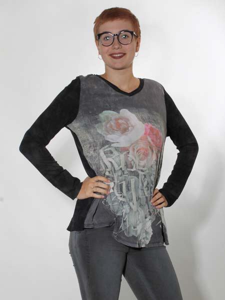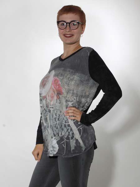 mit Blumen und Schriftzeichen ist der Viscosestoff dieser Longbluse Tunika von Simclan am Vorderteil. Auch die schwarzen Stoffe am Rückenteil und den Ärmeln sind verwaschen dunkelgrau bedruckt, das Rückenteil ist aus Viscosestoff, die Ärmel sind aus Baumwolljersey und elastisch. Die Tunika ist leicht A-förmig geschnitten. Sie hat an Vorder- und Rückenteil kurze V-Ausschnitte. Länge der Bluse ca. 75 cm.