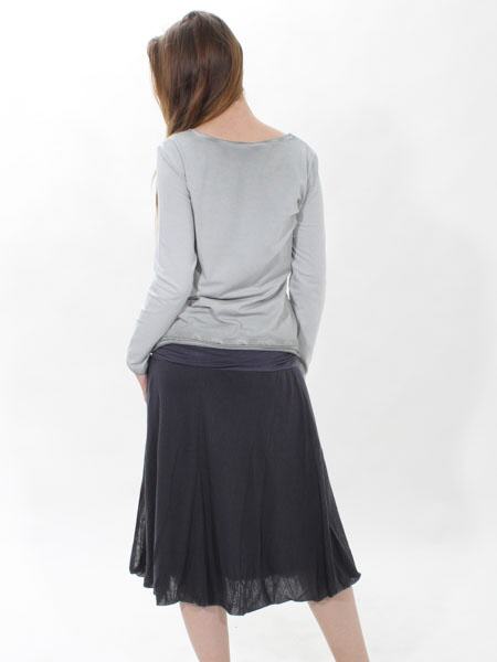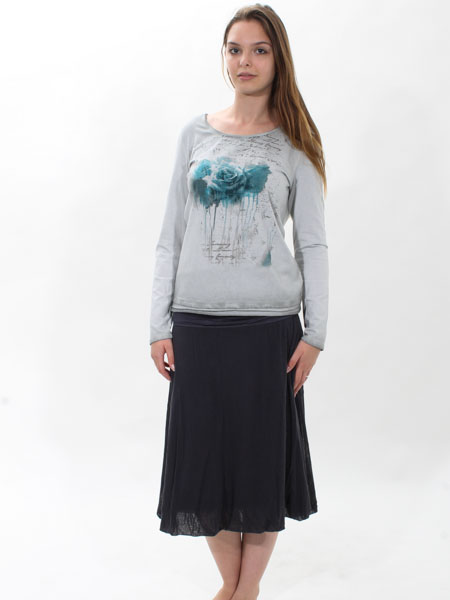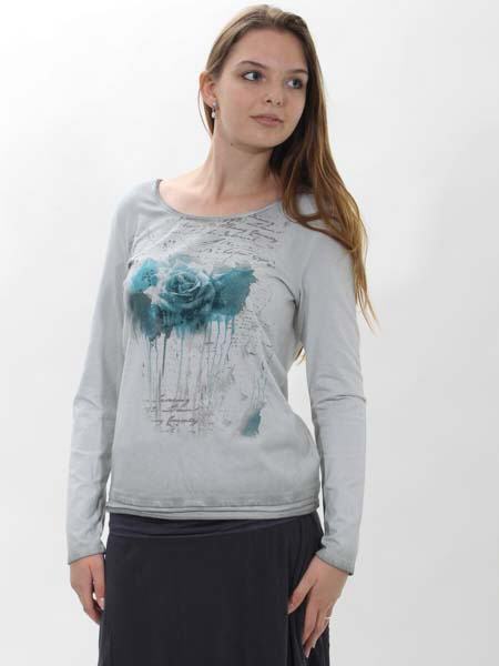 wirkt der Baumwolljersey dieses Shirts von Simclan. Wir haben es in der Farbe silbergrau im Angebot. Der Halsausschnitt hat einen doppelten Rollrand. Bezaubernd ist der Rosendruck aus dem Vorderteil. Länge des Shirts ca. 61 cm.