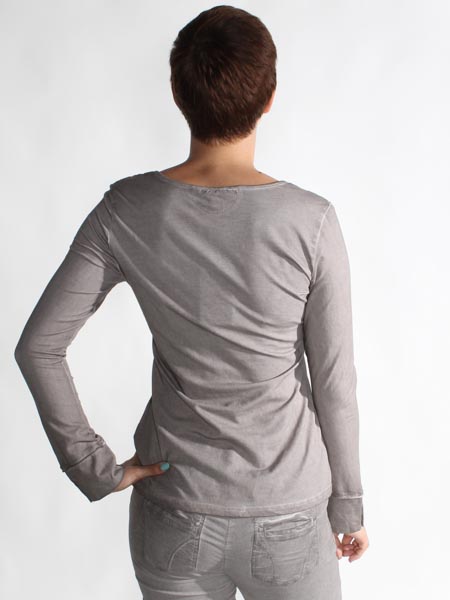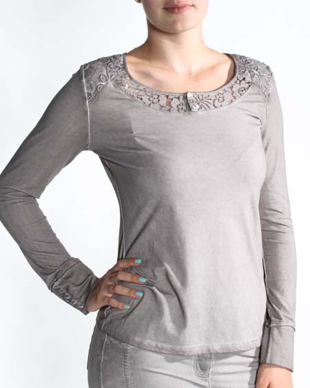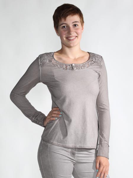 wirkt der Baumwolljersey dieses Shirts von Simclan. Wir haben es in der Farbe taupe im Angebot. Die Schulterpasse ist doppellagig, Spitzenstoff über dem Jersey. Entlang des Halsausschnittes ist das Shirt aus feinem Spitzenjersey, leicht transparent. Das Shirt hat am Halsausschnitt 3 kleine Druckknöpfe. Es hat Ärmelmanschetten mit Druckknöpfen. Länge des Shirts ca. 65 cm.