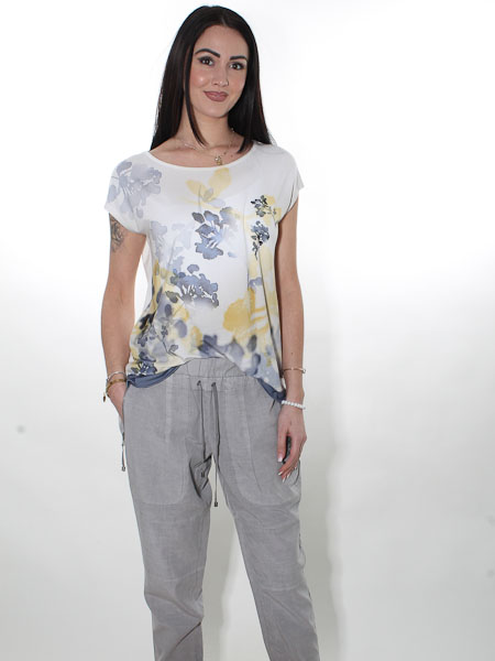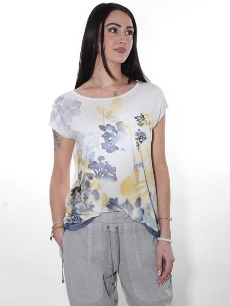haben wir dieses süße Shirt von Simclan, weißgrundig, bedruckt mit acquarellierten Blumen in gelb/jeansblau. Das Rückenteil ist uni weiß. Es hat überschnittene Schultern, ist kastig geschnitten, hat kurze Schlitze an den Seitennähten. Länge ca. 66 cm in Größe 38.