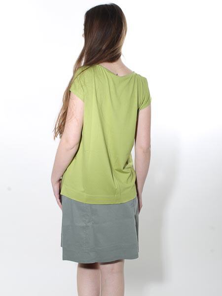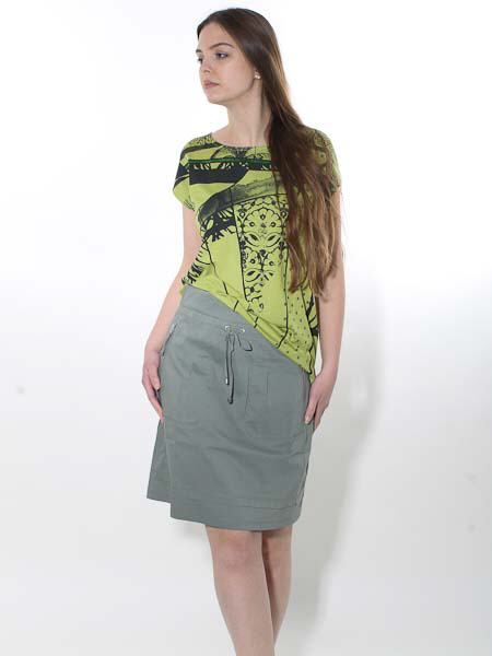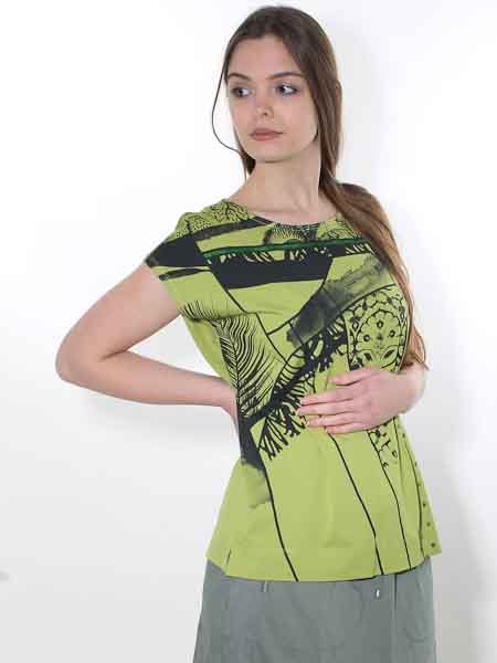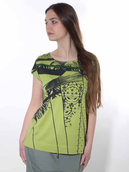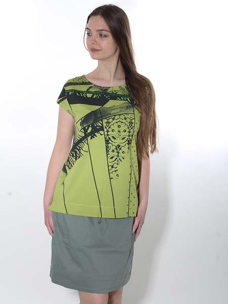 ist dieses Shirt von Simclan, wir haben es in olivgrüngrundig, bedruckt in schwarz, dunkelgrün und ein wenig smaragdgrün. Es hat überschnittene Schultern, kurze Schlitze an den Seitennähten, ist nicht tailliert. Das Rückenteil ist uni weiß bzw. olivgrün. Länge des Shirts ca. 64 cm in Gr. 36.