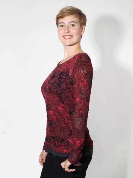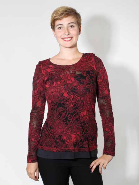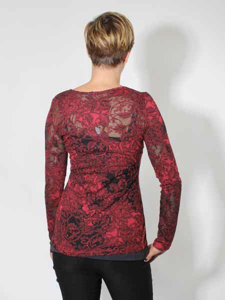 ist dieses Shirt von Simclan, ein dunkelgraues Top mit verstellbaren Spaghettiträgern, darüber ein Shirt aus einem weinrot/schwarzen Ausbrennerstoff, leicht transparent an den schwarzen Partien. Das Shirt ist leicht tailliert. Länge ca. 67 cm. Im Etikett steht die Größe 38, es fällt jedoch sehr knapp aus, entspricht eher einer Größe 36.