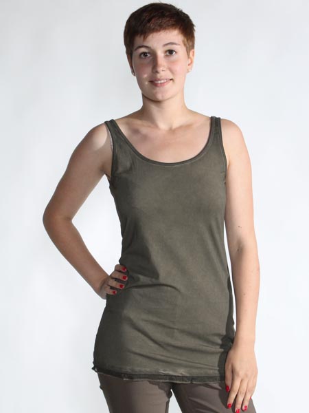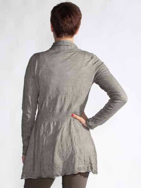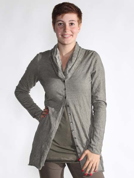 ist der feine kahkifarbene Strickstoff dieser langen Jacke von Simclan. Sie wird mit vielen kleinen Knöpfen geschlossen. Schön ist der geraffte Kragen, schön hoch am Hals. Länge der Jacke ca. 88 cm. Wir haben ein farblich passendes Longtop darunter.