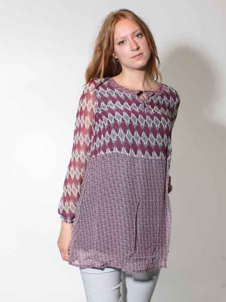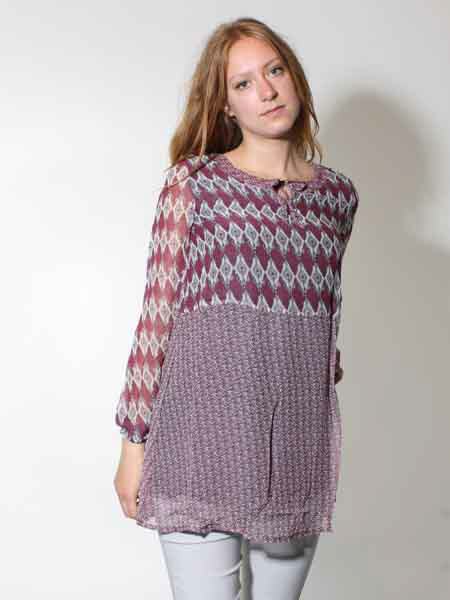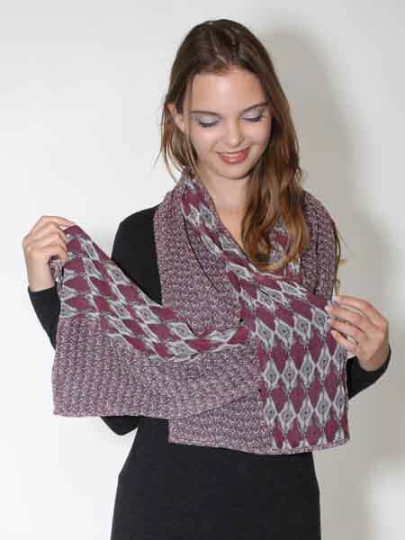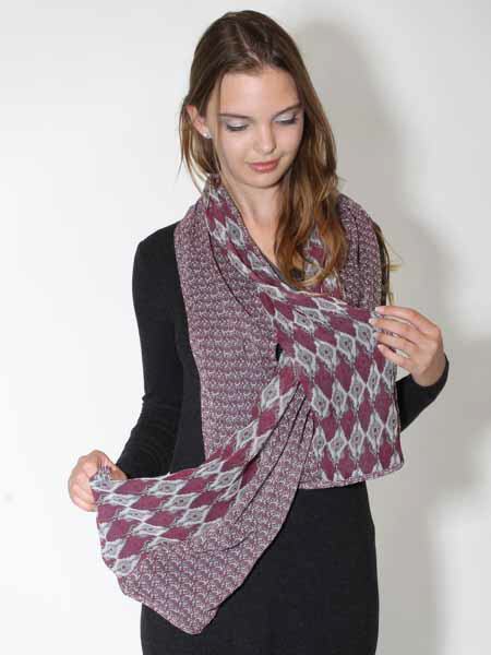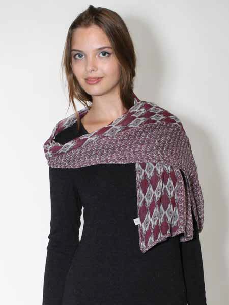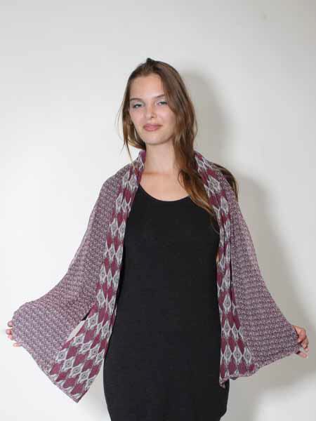 ist dieses Tuch von Simclan. Die Oberstoffe sind unterschiedlich in weinrot/anthra/silber gemustert, gefüttert mit leichtem, elastischem Viscosejersey in anthra. Das Tuch hat an der Mitte einen Schlitz, durch den Sie die andere Seite des Tuches ziehen können. Länge ca. 85 cm. In diesem Stoff haben wir auch eine Bluse.