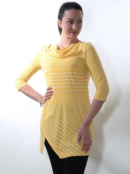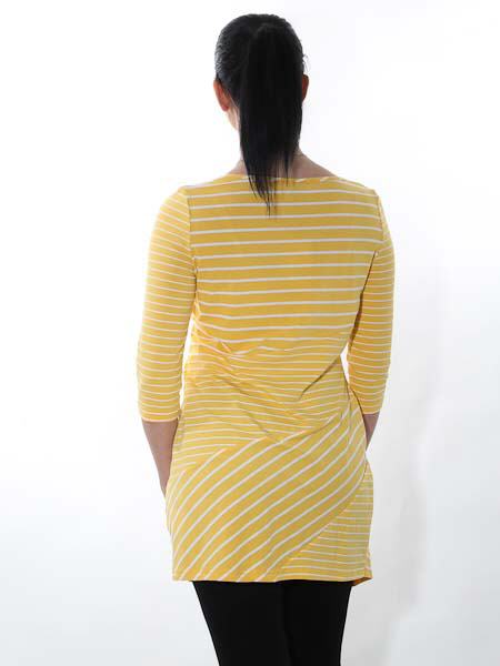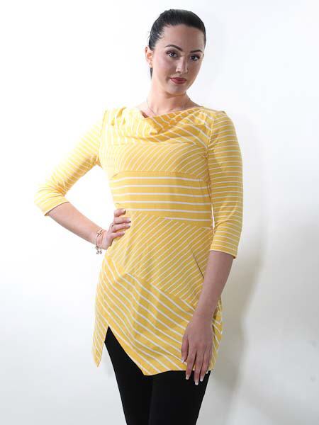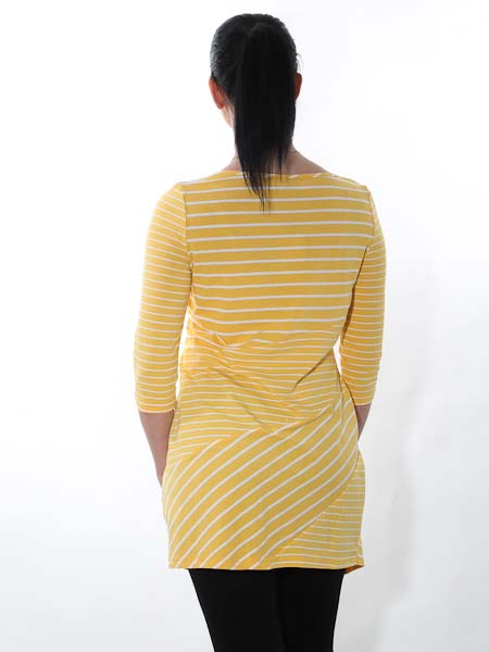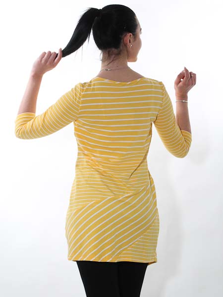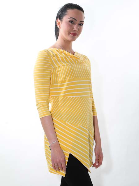 gearbeitet ist diese Tunika von Simclan, im Streifenmuster gelb mit wollweiß, der elastische Jersey ist waagrecht und diagonal verarbeitet. Die Ärmel sind 3/4 lang. Der Saum ist am Vorderteil asymmetrisch geschnitten, am R´ückenteil gerade. Länge der Tunika am Rückenteil ca. 87 cm in Gr. 38, am Vorderteil an den Enden etwas länger.