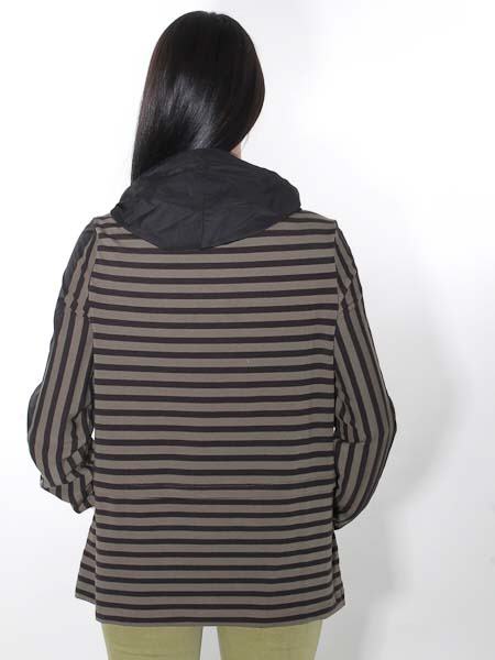 gestreift der elastische Jersey dieser aparten Tunika von Simclan, im Streifenmuster senkrecht und waagrecht. Sie hat eine Kapuze aus schwarzem Webstoff, der sich gut knautschen läßt. Mit Bändern läßt sich die Weite raffen. Am Vorderteil sind 2 Taschen eingearbeitet. Der mittlere Part an den Ärmeln ist auch aus Webstoff. Die Ärmel haben als Abschluß einen Gummidurchzug. Die Tunika ist leicht A-förmig geschnitten. Länge ca. 70 cm in Gr. 38.