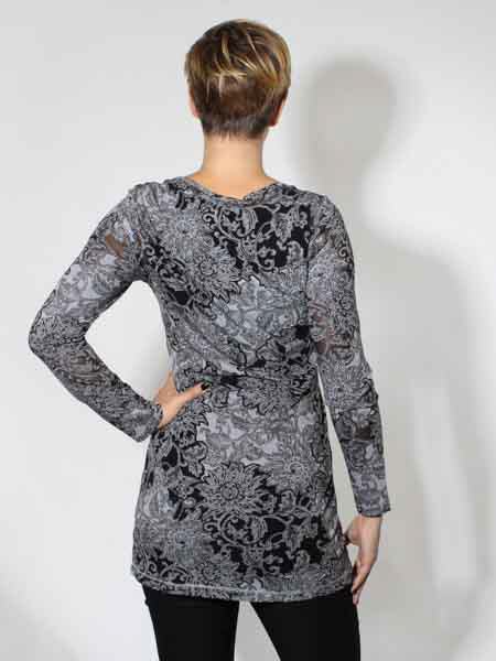 ist dieses Longshirt von Simclan, ein schwarzes längeres Top mit breiten Trägern, darüber eine Tunika aus einem silbergrau/schwarzem Ausbrennerstoff, leicht transparent an den schwarzen Partien. Die Tunika hat am Ausschnitt einen kurzen Schlitz und einen Haken als Verschluß. Die Tunika ist leicht tailliert, vorne etwas kürzer als hinten. Länge vorn ca. 79 cm, hinten ca. 85 cm.
