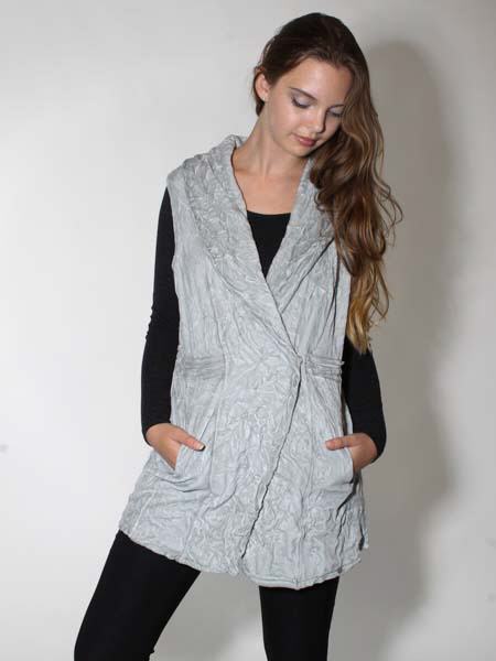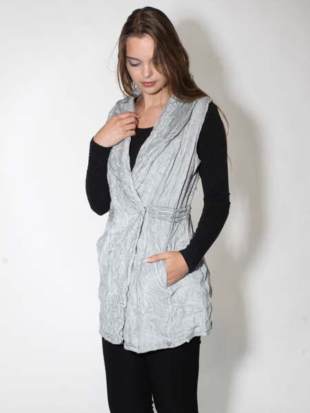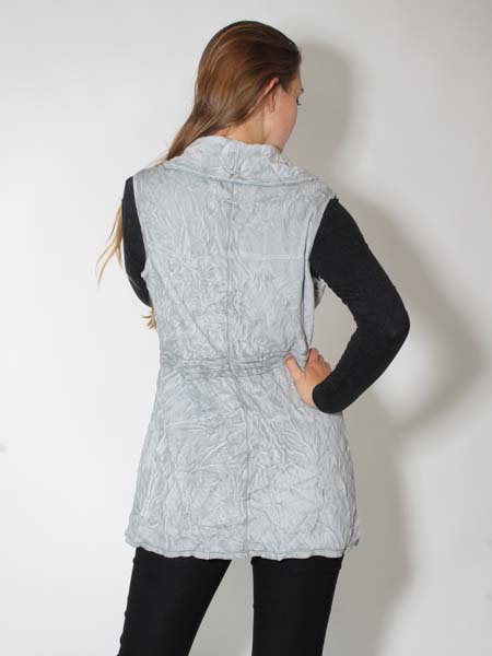 ist diese silbergraue Weste von Simclan gearbeitet, superschick, lässig und bequem. Sie wird mit 2 Druckknöpfen geschlossen, hat einen Schalkragen, 2 senkrechte Eingrifftaschen. Länge ca. 76 cm am Rückenteil, vorne etwas länger.