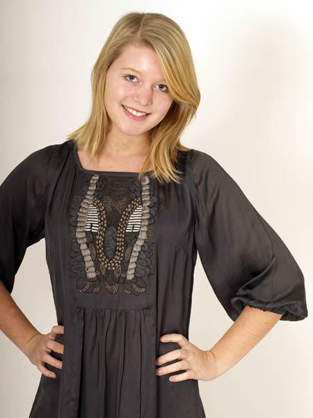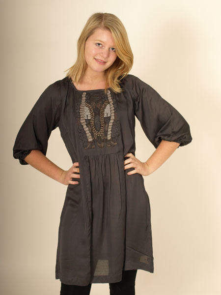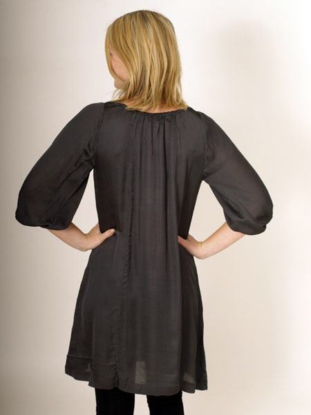 in den Farben schlamm und silber ist die Passe dieser/s Tunika/Kleides von nü by Staff, in der Farbe thunder grey, einem warmen Dunkelgrau. Die Tunika hat Emprielinie, angekrauste Ärmel, die 3/4 langen Ärmel haben am Saum Gummidurchzug. Länge der Tunika ca. 91 cm.