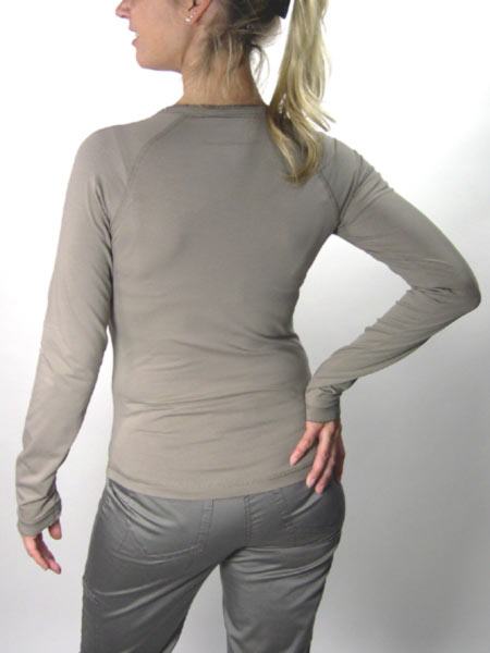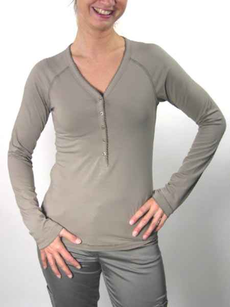 wirkt dieses Shirt in kahki von Staff. Die Knopfleiste und der V-Ausschnitt sind zart umhökelt im Wäschestil. Das Shirt ist leicht tailliert, Länge ca. 62 cm.