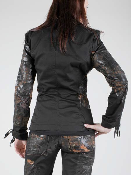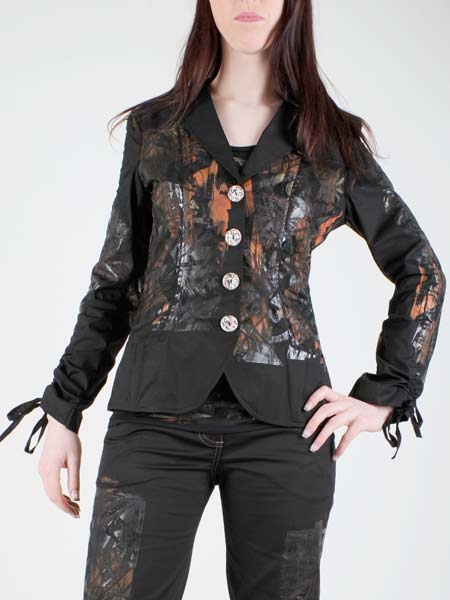 Superschicke Jacke von Legatte, am Vorderteil und an den Seiten sowie an den Ärmeln bedruckt in braun/cognac und schwarz-glänzenden Strichen. Der Ärmel läßt sich mit Bändern bis zur Schulter raffen und in der Länge verkürzen. Die Jacke ist gut tailliert, in ihr zeigen Sie Figur. Länge ca. 63 cm. Die Knöpfe sind aus bedrucktem Kunstleder, mit kleinen Nieten verziert. Passend dazu haben wir eine Hose im Angebot.
