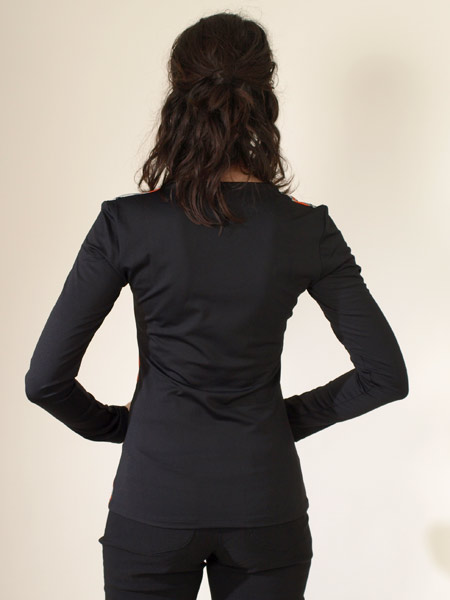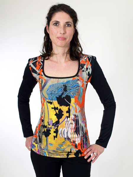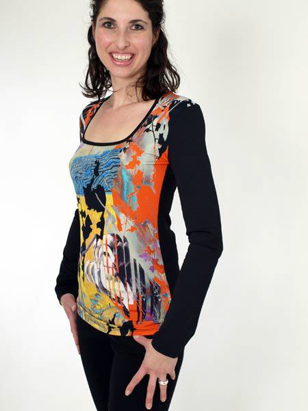 hat dieses Shirt von Save The Queen, farbenfroh am Vorderteil. Rückenteil und Ärmel sind uni schwarz. Der Jersey ist leicht glänzend. Länge des Shirts am Rückenteil ca. 63 cm, am gerundeten Saum des Vorderteils ca. 66 cm.