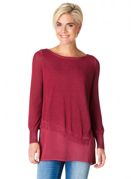 an Vorder- und Rückenteil ist dieser weinrote Pulli von Yest, innen aus Webstoff, außen gestrickt. Der gestrickte Part ist am Saum asymmetrisch. Die Ärmel sind gestrickt. Der Pulli ist kastig geschnitten, lässig und bequem. Es hat einen breiten Halsausschnitt. Länge ca. 76 cm in Gr. 40.