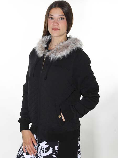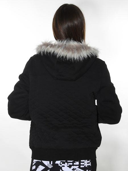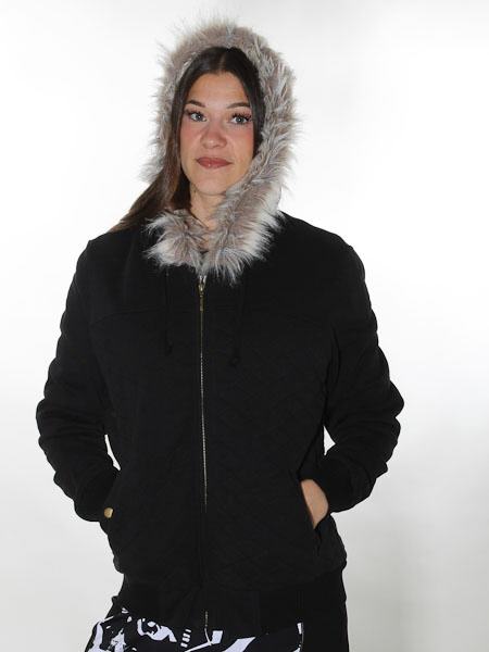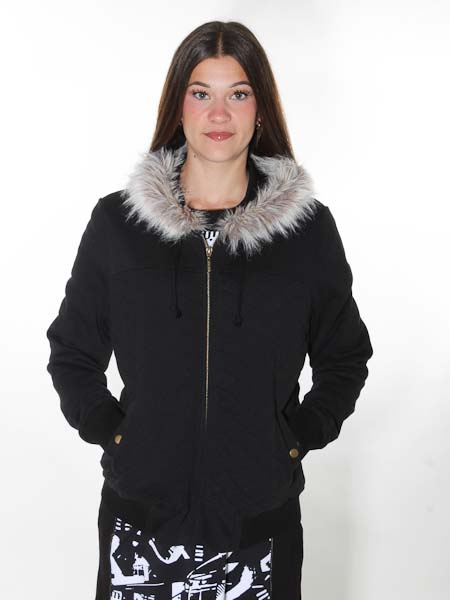 ist dieser Blouson, diese Kapuzenjacke Carrie in der Farbe schwarz von Yest. Sie ist schwarzem Baumwolljersey, ist doppelt gearbeitet und mit schwarzem Baumwolljersey gefüttert. Die Parts unterhalb der Schulterpasse an Vorder- und Rückenteil sind wattiert und in Rauten abgesteppt. Auch der mittlere Part der Kapuze ist wattiert und abgesteppt. Schmeichelnd ist die Kunstfellkante an der Kapuze. Die Weite der Kapuze können Sie mit Bändern reguiieren. Die Jacke wird mit einem kupferfarbenen Reißverschluß geschlossen. Auf den Vorderteilen sind 2 Eingrifftaschen, verschließbar mit einem Druckknopf. Die Saumbündchen an Vorder- und Rückenteil und der Ärmel sind in Rippe gestrickt. Länge ca. 66 cm in Größe 42.