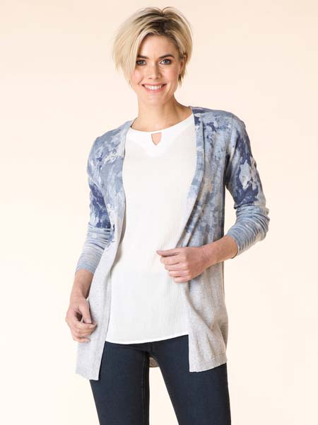 ist diese leichte Strickjacke von Yest, Grundfarbe silbergraumelange, bedruckt in hellbleu, jeansblau und dunkelblau. Sie ist verschlußlos. Länge ca. 75 cm in Gr. 42. Die Strickjacke sieht toll aus zu verwaschenen Jeans.