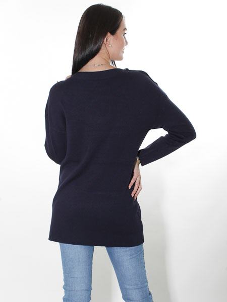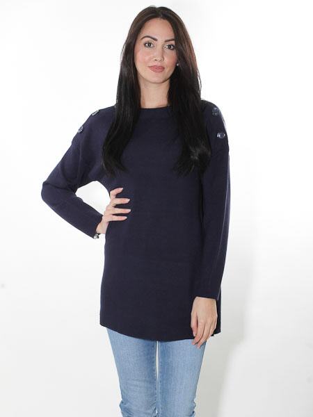 ist dieser lange Pulli von Yest, glatt rechts dick gestrickt in dunkelblau. Er hat einen flachen U-Boot-Ausschnitt, hat eine Knopfleiste mit je 3 großen Knöpfen auf den Schulternähten. Er hat überschnittene Schultern, ist kastig geschnitten. Länge in Gr. 40 ca. 80 cm. Unser Model ist 182 cm groß.