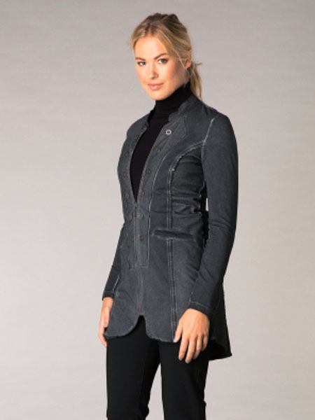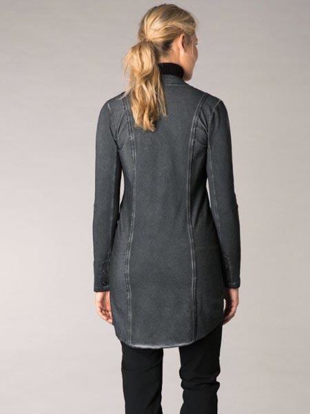 im Vintage-Look wirken die Jerseystoffe dieser lässigen Jacke in anthrazit dunkelgrau von Yest. Sie ist leicht tailliert. Sie hat einen Stehkragen, wird mit einem Metall-RV geschlossen. Parallel zum RV sind Metallknöpfe aufgenäht. Sie hat 2 bequeme Pattentaschen. Länge ca. 89 cm.