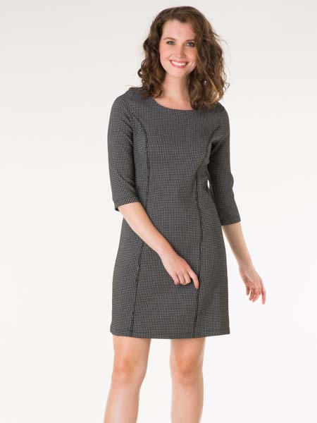 in schwarz wollweiß ist dieses aparte Kleid von Yest gefertigt, eine Techno-Qualität, ideal für Büro und Freizeit. Es hat Teilungsnähte an Vorder- und Rückenteil, ist damit figurbetonend, trotzdem zeichnet sich nichts ab. Es ist leicht tailliert, etwas ausgestellt zum Saum hin. Die Ärmel sind 3/4 lang. Länge ca. 94 cm in Gr. 38.