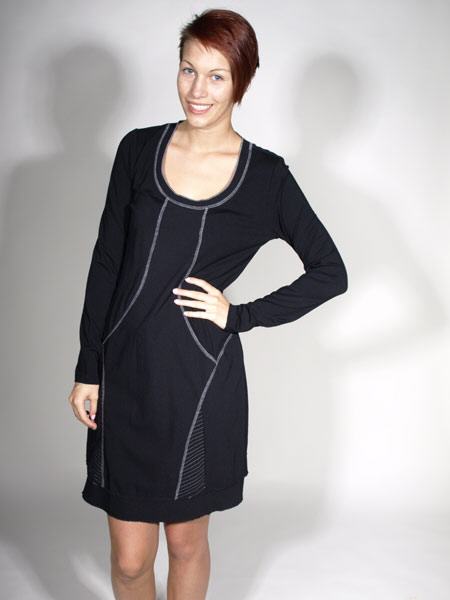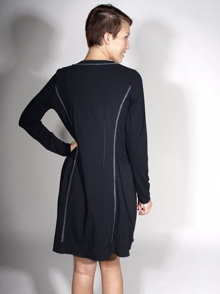 Schickes schwarzes Kleid von Yest, tailliert, zum Saum hin ausgestellt. Alle Nähte sind mit grauen Kettelnähten betont. Länge ca. 95 cm. Das Kleid fällt relativ groß aus, deshalb haben wir z. B. bei der Gr. 36 eine 36/38 angegeben.