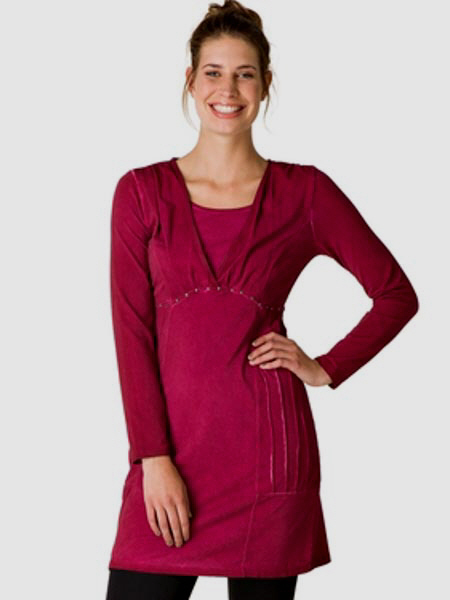 wirkt der weinrote Jerseystoff dieses Kleides von Yest. Die Empirenaht ist betont mit vielen verschiedenen Nieten und Steinchen. Länge des Kleides ca. 95 cm.