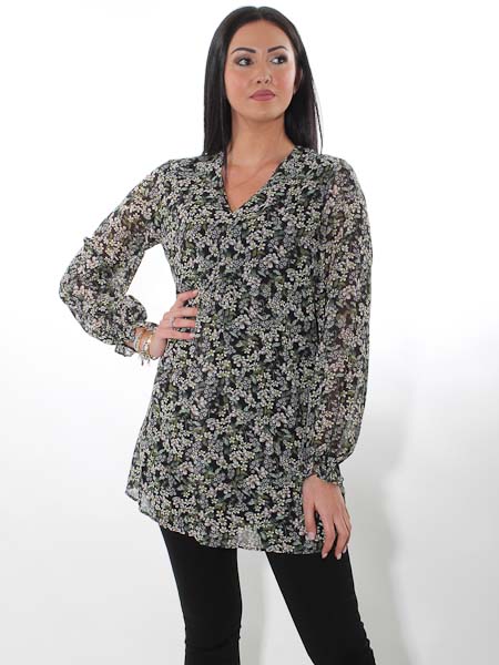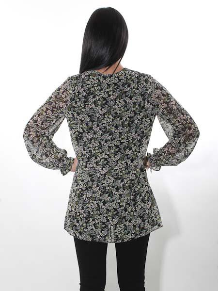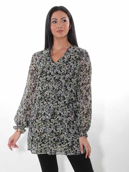 ist der Stoff dieser langen Bluse von Yest, der Stoff ist schwarzgrundig, bedruckt mit Blümchen und Blättern in weiß und vielen Grüntönen. Vorder- und Rückenteil sind doppellagig, gefüttert mit einem schwarzen Viscosejersey. Die Ärmel sind nicht gefüttert, leicht transparent. Das Shirt hat einen tiefen V-Ausschnitt. Länge ca. 91 cm in Gr. 44.