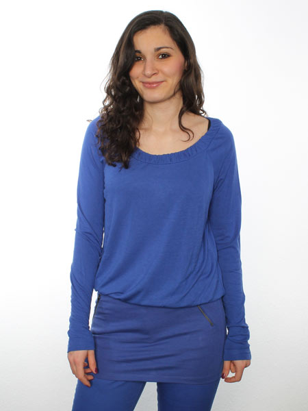 und bequem am Oberteil ist dieses kobaltblaue Longshirt von Yest, mit Raglanärmeln und gecrashter Halsausschnittblende. Am breiten Hüftbund hat es 2 Reißverschlußtaschen, nur zur Zierde. Es hat eine Länge von 88 cm, der breite Hüftbund läßt sich gut nach oben ziehen, so wird das Longshirt kürzer.