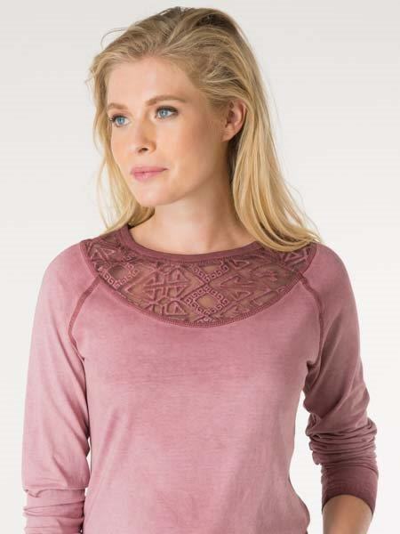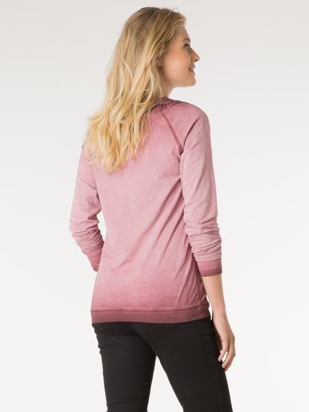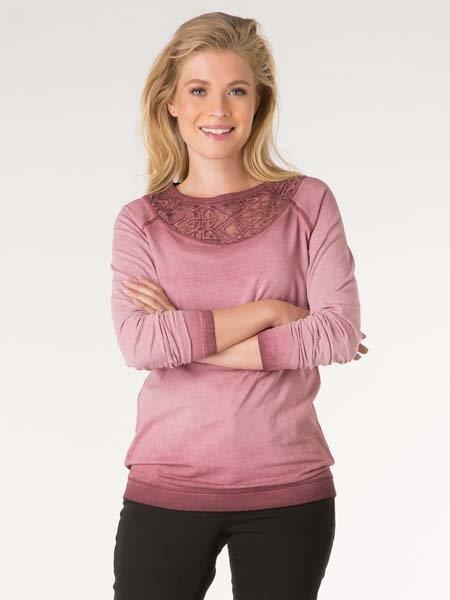 ist der breite Spitzeneinsatz am Halsausschnitt bei diesem schönen Shirt von Yest. Es ist leicht verwaschen im Farbverlauf in dark berry (dunkle Beere) bedruckt. Die Nähte sind mit aussenliegenden Kettelnähten betont. Länge ca. 69 cm in Gr. 44.